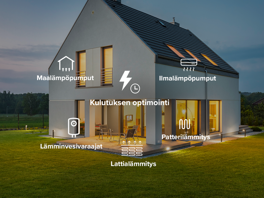 Pörssisähkön hinnan mukaan automatisointi on mahdollista myös suurempiin rakennuksiin, sekä kiinteistökokonaisuuksiin. Ota ammattilaismyyntiimme yhteyttä numeroon +358 20 7306 181 ja kerro lisää kohteestasi.